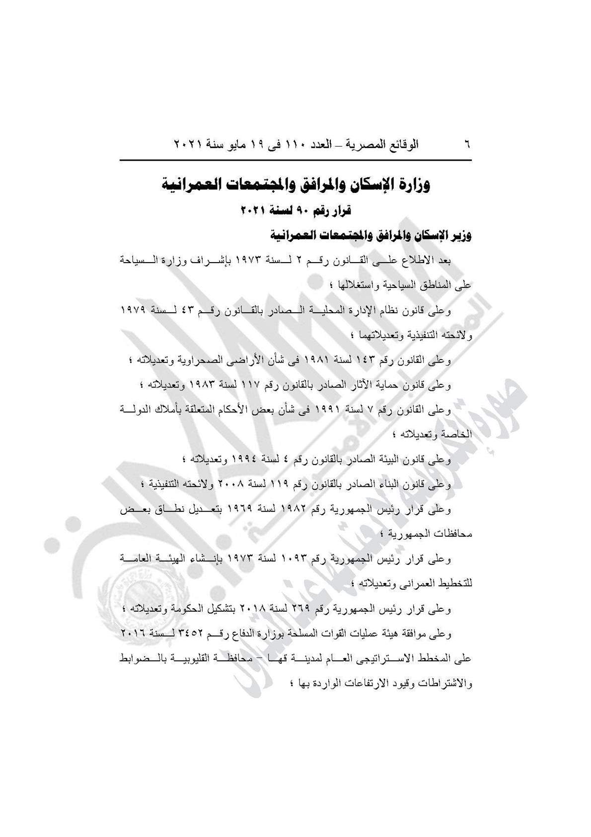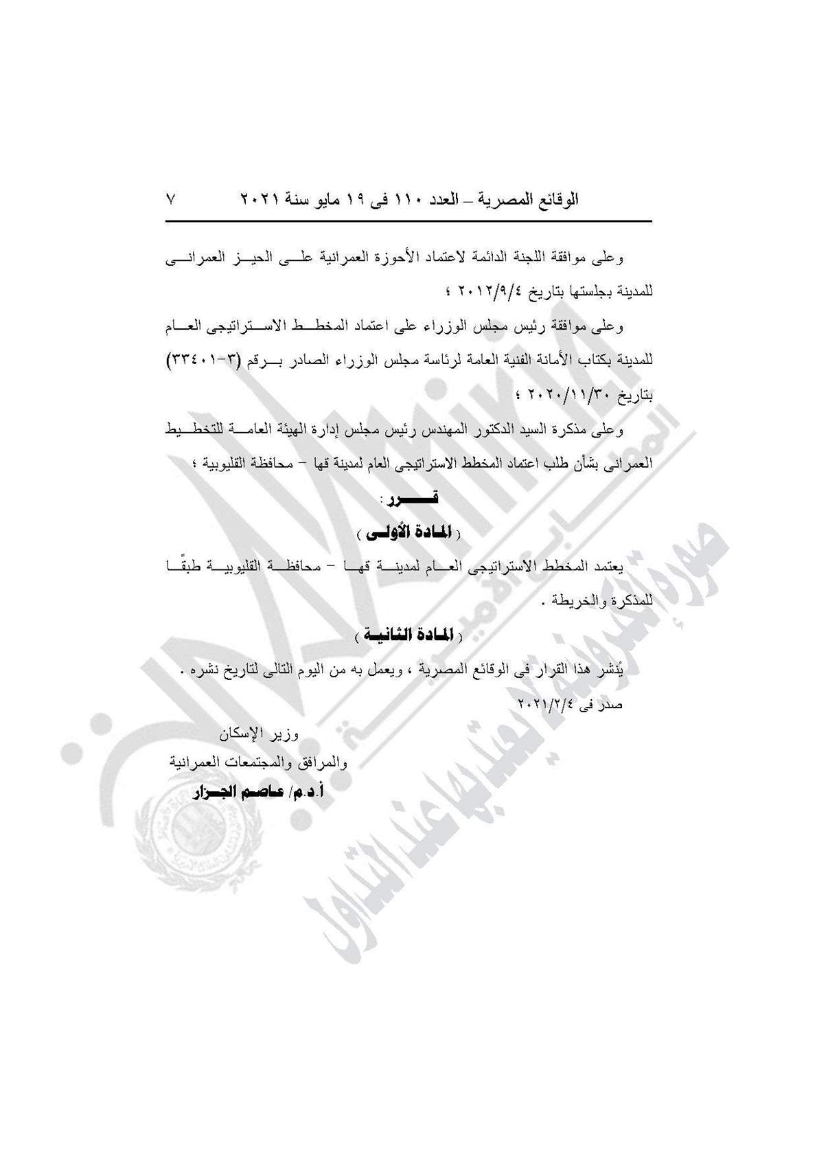 والقرار رقم 90 لسنة 2021، بشأن اعتماد المخطط الاستراتيجي العام لمدينة قها، بمحافظة القليوبية طبقًا للمذكرة والخريطة.