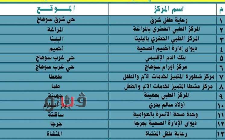 " على أماكن مراكز تلقى لقاح كورونا فى مختلف مراكز ومدن محافظة سوهاج والبالغ عددها 14 مركزا على مستوى مراكز ومدن المحافظة .