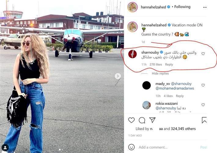 حرص الفنان محمد الشرنوبي، على مداعبة الفنانة هنا الزاهد في تعليق على الصورة التي نشرتها عبر حسابها بـ"إنستجرام" وهي داخل كابينة طائرة.