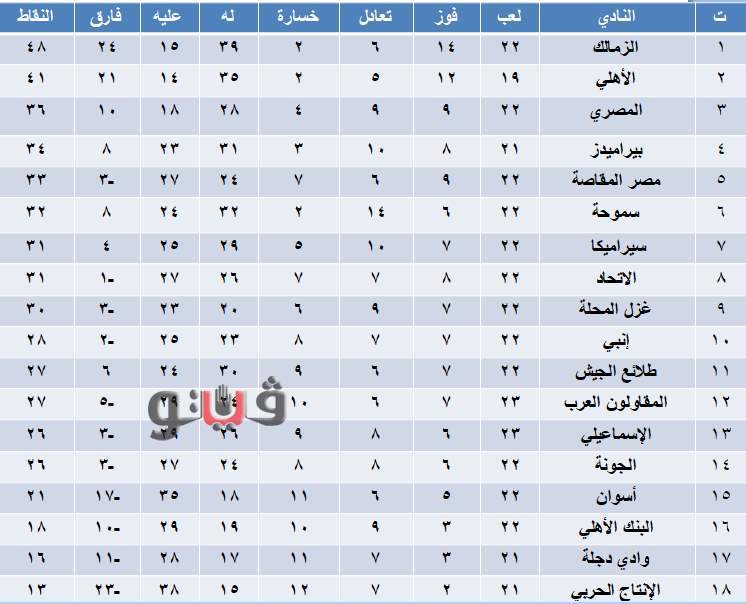 جدول ترتيب الدوري الممتاز بعد فوز المقاولون والمقاصة