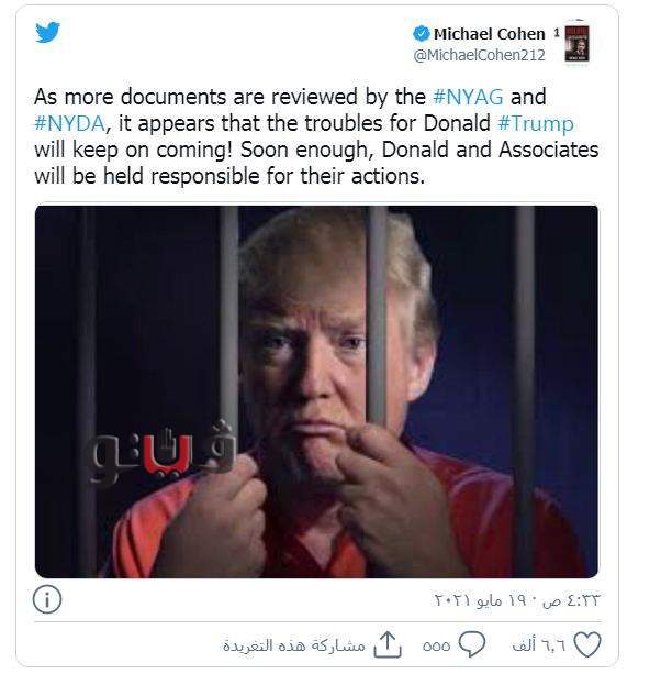 وأرفق "كوهين" الصورة التي نشرها في تغريدة عبر "تويتر"، بتصريح قال فيه: "مع مراجعة المزيد من الوثائق من قِبل المدعي العام لولاية نيويورك، يبدو أن مشاكل دونالد ترامب ستستمر في الظهور! بعد فترة وجيزة، سيتحمل دونالد وشركاؤه المسئولية عن أفعالهم".