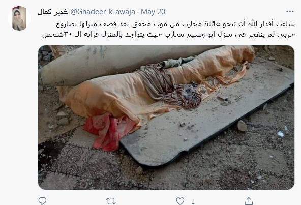 وتداول ناشطون فلسطينيون عبر مواقع التواصل الاجتماعي صورة من داخل منزل العائلة، التي اخترقها الصاروخ الإسرائيلي، وقد استقر الصاروخ في وسط إحدى الغرف ساكناً دون أن ينفجر مثله مثل عدد لا بأس به من الصواريخ التي لا تنفجر خلال أي حرب تشنها إسرائيل على الفلسطينيين.