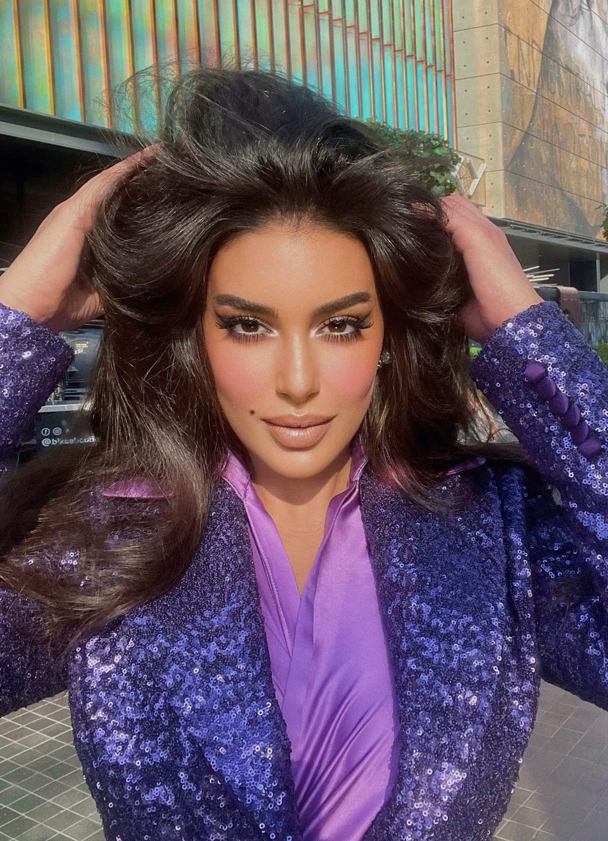 وتعتبر من أحدث إطلالتها ظهورها ببدلة نسائية أنيقة بالون البنفسج اللامح..