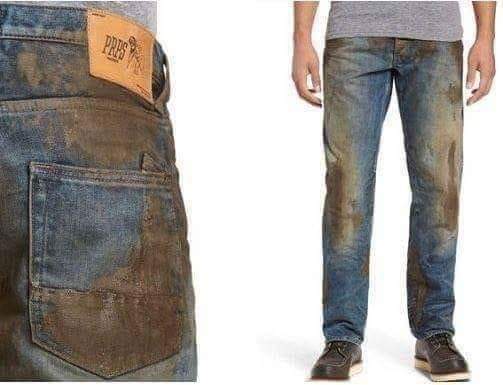 ولا يمكن ونحن نتحدث عن هذا النوع من الموضة، أن ننسى البنطلون الطيني، وهو بنطلون يغلب على أجزاء منه لون التراب مثل بنطالونات من يعملون في الحقول والأرض، وفي بداية ظهوره أعجب بها الشباب، ووجدوا أنه لا مشكلة من شرائه مثله مثل البنطلون المحروق، وهو أسوأ من البنطال الممزق حيث يظهر وكأنه بالى بشكل كبير، ويوجد به الكثير من التمزقات وكأنه تعرض بالفعل للحرق.