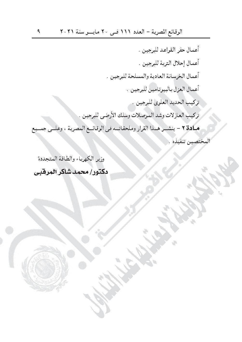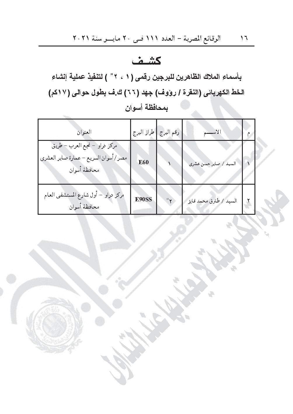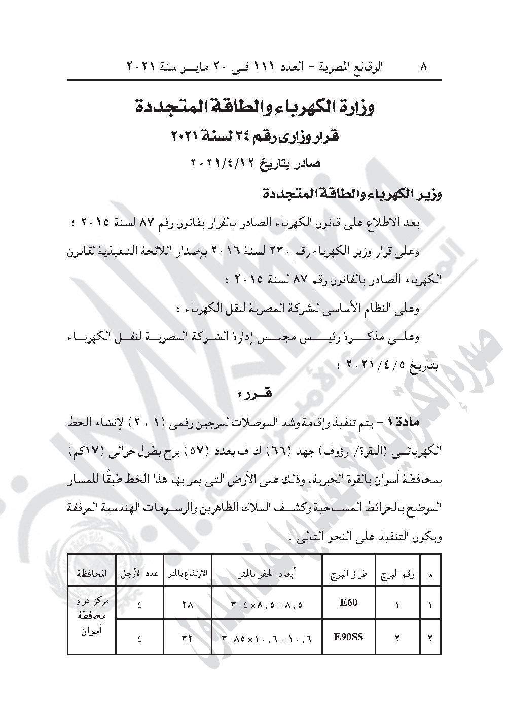 نشرت جريدة الوقائع المصرية في عددها رقم 111، الصادر في 20 مايو 2021، قرار وزارة الكهرباء والطاقة المتجددة رقم 34 لسنة 2021، تنفيذ وإقامة وشد الموصلات للبرجين رقمى (1،2) لإنشاء الخط الكهربائي (النقرة/ رؤوف) بمحافظة أسوان بالقوة الجبرية، وذلك على الأرض التي يمر بها هذا الخط.
