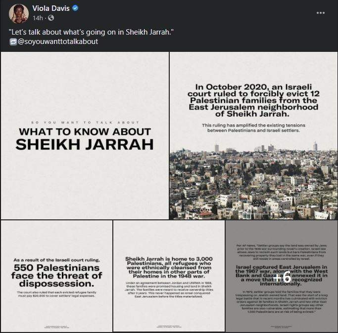 وفي مقال مطول.. حاولت النجمة العالمية فيولا ديفيس، الحاصلة على جائزة أوسكار لعام 2021، أن تشرح من خلاله قضية القدس، بل وأرفقتها بصور تشرح سياق القرار الإسرائيلي بتهجير أهالي هذا الحي المقدسي.