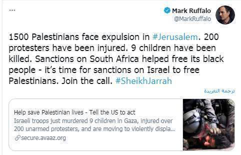وجاءت إحدى أهم خطوات التضامن من الممثل الهوليوودي الكبير "مارك رافالو" الذي نشر على "تويتر" عريضة تطالب القادة الدوليين بفرض عقوبات على الصناعات الإسرائيلية الرئيسية "إلى حين يتم منح الفلسطينيين حقوقاً مدنية كاملة ومتساوية".
