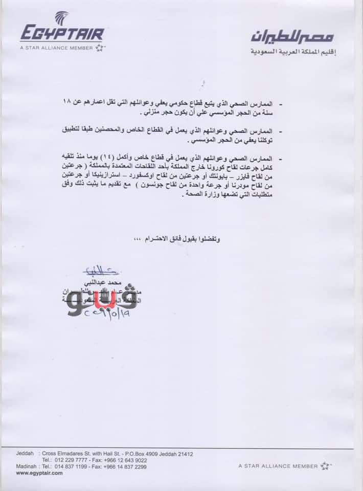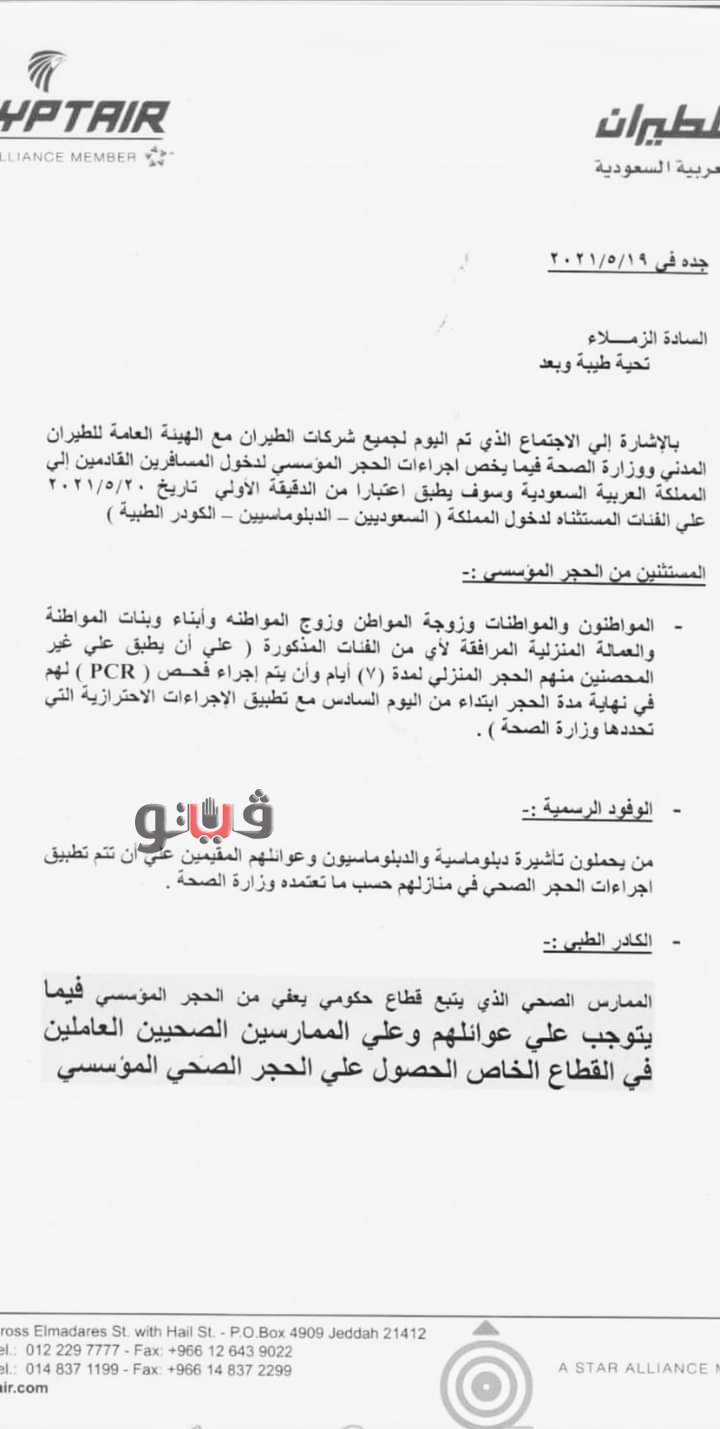 وألزمت سلطة الطيران المدني منشورا علي شركات الطيران ووكلاء السياحة بالشروط الجديدة للسماح بدخول الفئات المستثناة والتي تشمل كل من «السعوديين - الدبلوماسيين - الكوادر الطبية» وهي:
