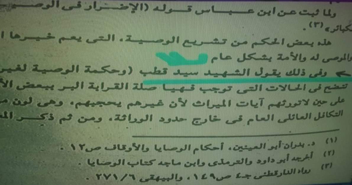 وجاء نص الفقرة كالتالي: «هذه بعض الحكم من تشريع الوصية التي يعم خيرها الموصي له والأمة بشكل عام وفى ذلك يقول الشهيد سيد قطب وحكمة الوصية لغير الورثة».