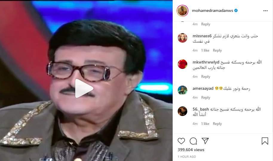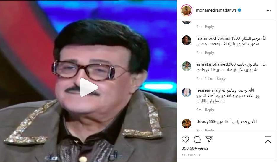وعلق رمضان على الفيديو قائلاً :"الله يرحمك ويسكنك فسيح جناته يا عملاق المسرح واسطورة الكوميديا #أستاذ #سمير_غانم امتعتني كمشاهد وشهادتك في تاريخي وسام اتشرف به طول عمري .. ربنا يصبر قلوب كل جماهيرك واسرتك".