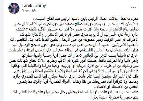 وكتب طارق فهمي تدوينة على الفيس بوك "مجرد ملاحظة: دلالات اتصال الرئيس بايدن بالسيد الرئيس عبد الفتاح السيسي: