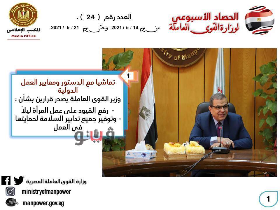 شهد حصاد الأسبوع الحالي، في وزارة القوى العاملة العديد من الأحداث المهمة خلال الفترة - من 14 مايو إلى 21 مايو الجاري- منها قرارين جديدين يقضيان برفع القيود المفروضة على إمكانية المرأة العمل ليلاً ، وتعيين 7 آلاف و 564 شابا في 7 محافظات ، وتكريم مدير مكتب القاهرة لبرنامج الأغذية العالمي التابع للأمم المتحدة ، واسترداد 7.5 مليون ليرة لبنانية قيمة الكفالة المصرفية لـ 5 عمال مصريين بلبنان .