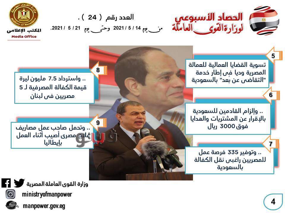 كما شمل الحصاد ، نجاح مكتب التمثيل العمالي التابع للوزارة بالسفارة المصرية ببيروت، في استرداد 7.5 مليون ليرة لبنانية قيمة الكفالة المصرفية لـ 5 عمال مصريين بلبنان.
