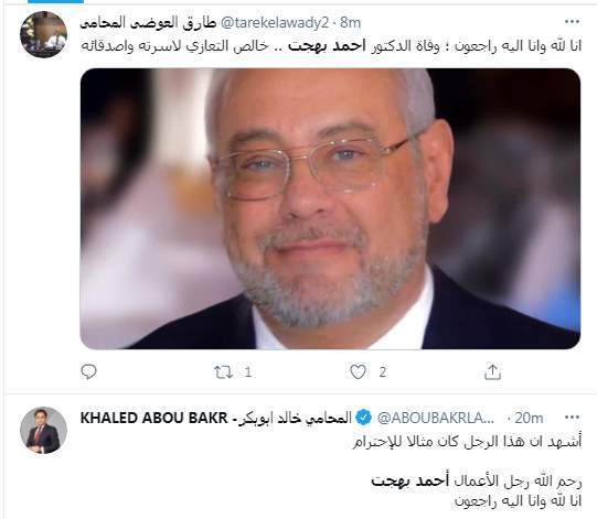 وكتب المحامي الحقوقي طارق العوضي " انا لله وانا اليه راجعون ؛ وفاة الدكتور احمد بهجت .. خالص التعازي لاسرته واصدقائه"
