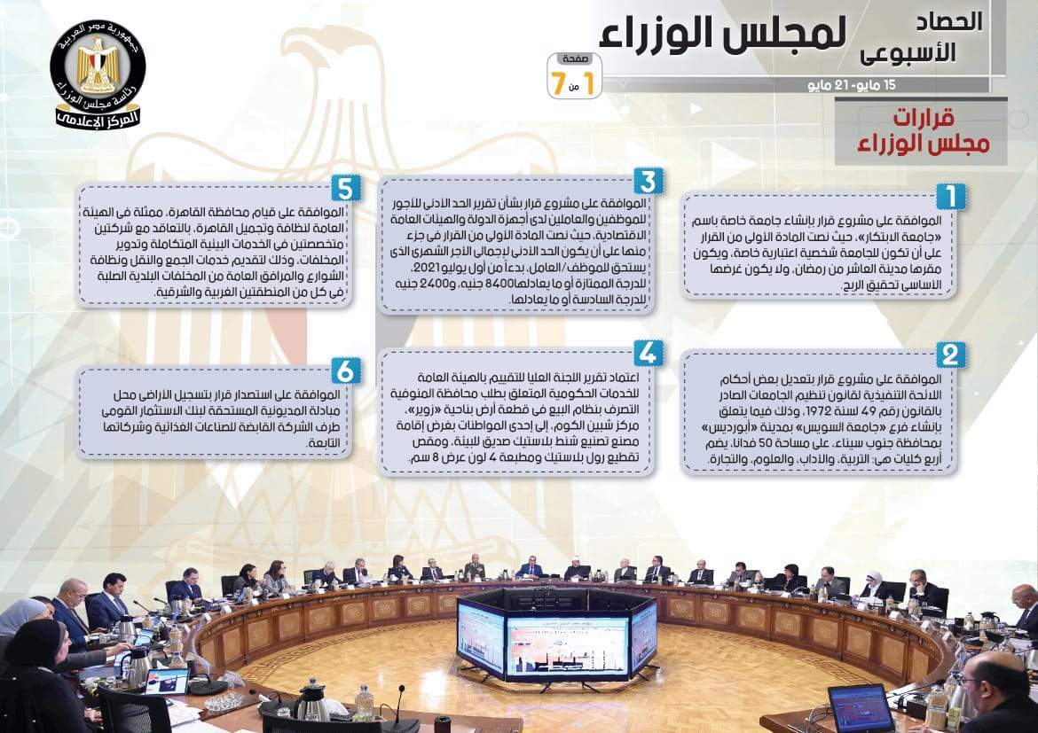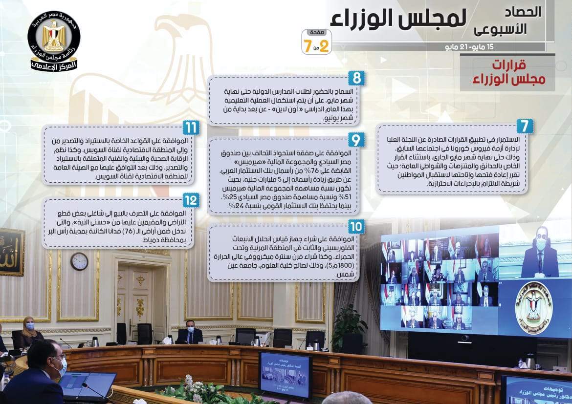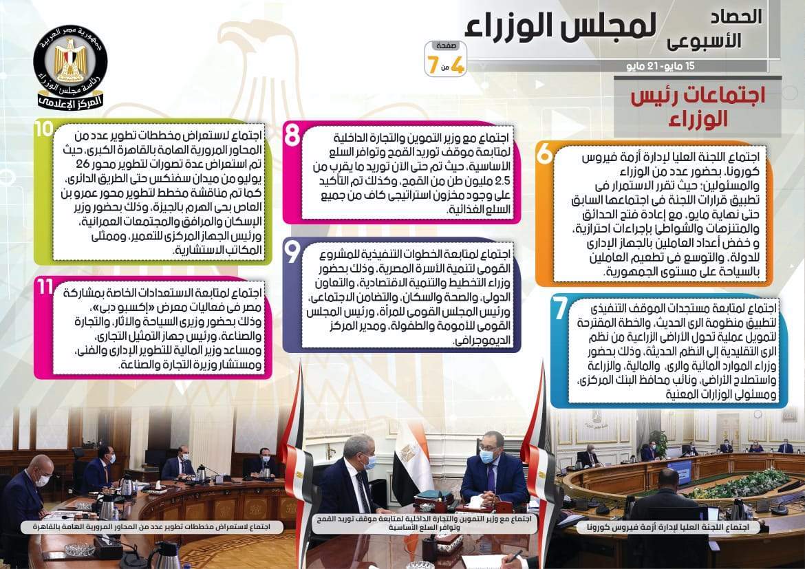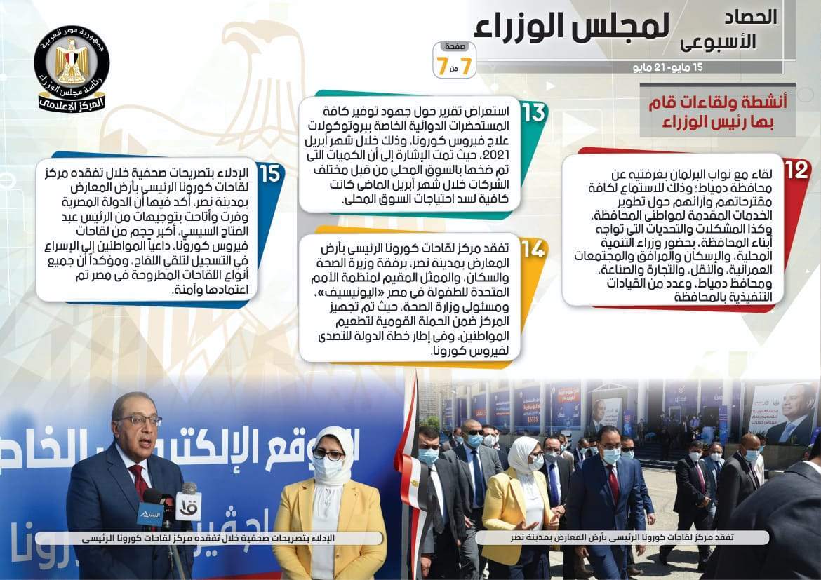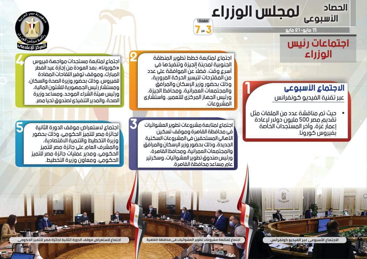 نشر المركز الإعلامي لمجلس الوزراء، تقريراً شمل إنفوجرافات سلط من خلالها الضوء على الحصاد الأسبوعي لمجلس الوزراء، وذلك خلال الفترة من15 حتى 21 مايو 2021، والذي تضمن الموافقة على عدد من القرارات، فضلاً عن الاجتماعات واللقاءات التي عقدها الدكتور مصطفى مدبولي، رئيس مجلس الوزراء، بالإضافة إلى ما قام به من أنشطة.