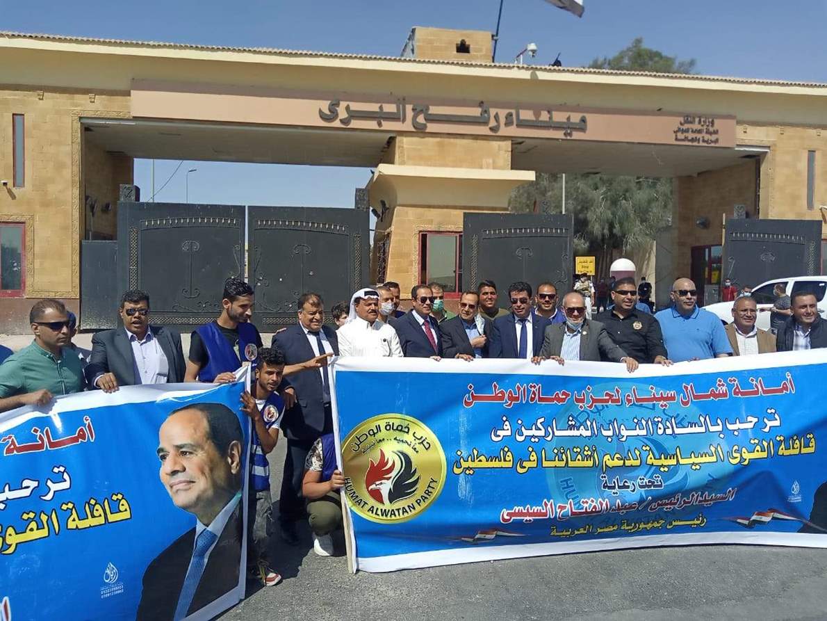 وكان في استقبال الوفد ومرافقته إلى معبر رفح البرى الدكتور محمد عبد الفضيل شوشة محافظ شمال سيناء , يسري جاسر أمين تنظيم حزب مستقبل وطن بشمال سيناء ، رحمى بكير وابراهيم أبو شعيرة وعبد العزيز مطر نواب المحافظة لمجلسى النواب والشيوخ وعدد من القيادات وأعضاء الأحزاب.