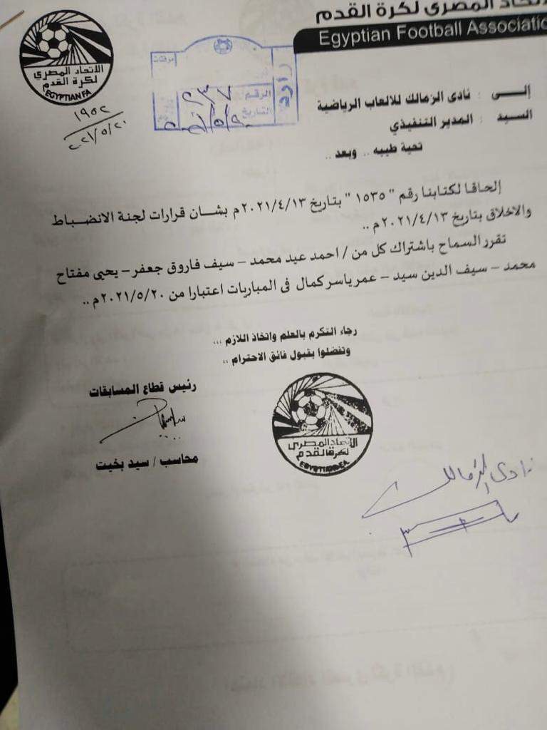 وكان النادي الأهلي أكد في بيانه تمسكه بتنفيذ العقوبة المؤيدة من لجنة الاستئناف بإيقاف لاعبي الزمالك «أحمد عيد - سيف فاروق – عمر ياسر – يحيى مفتاح – سيف الدين سيد» مواليد ٩٩، ثمانية مباريات، وغرامة مائة ألف جنيه؛ جراء قيامهم ببعض التجاوزات الأخلاقية عقب مباراة الأهلي والزمالك في «بطولة الجمهورية مواليد ٩٩» والتي أقيمت في ١١ـ٤ـ٢٠٢١، وعدم السماح لهم بالمشاركة في المباريات، وأن يبدأ عدد المباريات الموقوفين فيها بدءًا من المباراة الفاصلة بين الأهلي والزمالك مواليد ٩٩ والتي حدد اتحاد الكرة يوم ٢٦ مايو الجاري موعدًا لإقامتها بملعب السكة الحديد، وبالتالي تصبح مشاركة اللاعب سيف فاروق في مباراة ناديه مع طلائع الجيش في الدوري أمس الأول مخالفة للوائح والقوانين.