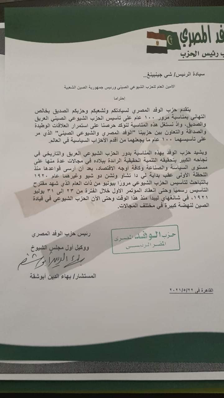 أرسل المستشار بهاء الدين أبو شقة رئيس حزب الوفد ووكيل أول مجلس الشيوخ برقية تهنئة للأمين العام للحزب الشيوعي الصيني ورئيس جمهورية الصين الشعبية بمناسبة مرور 100 عام على تأسيس الحزب.