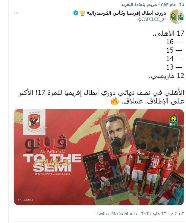وكتب الكاف عبر حسابه الرسمي على "تويتر": "الأهلي في نصف نهائي دوري أبطال إفريقيا للمرة 17! الأكثر على الإطلاق.. عملاق".