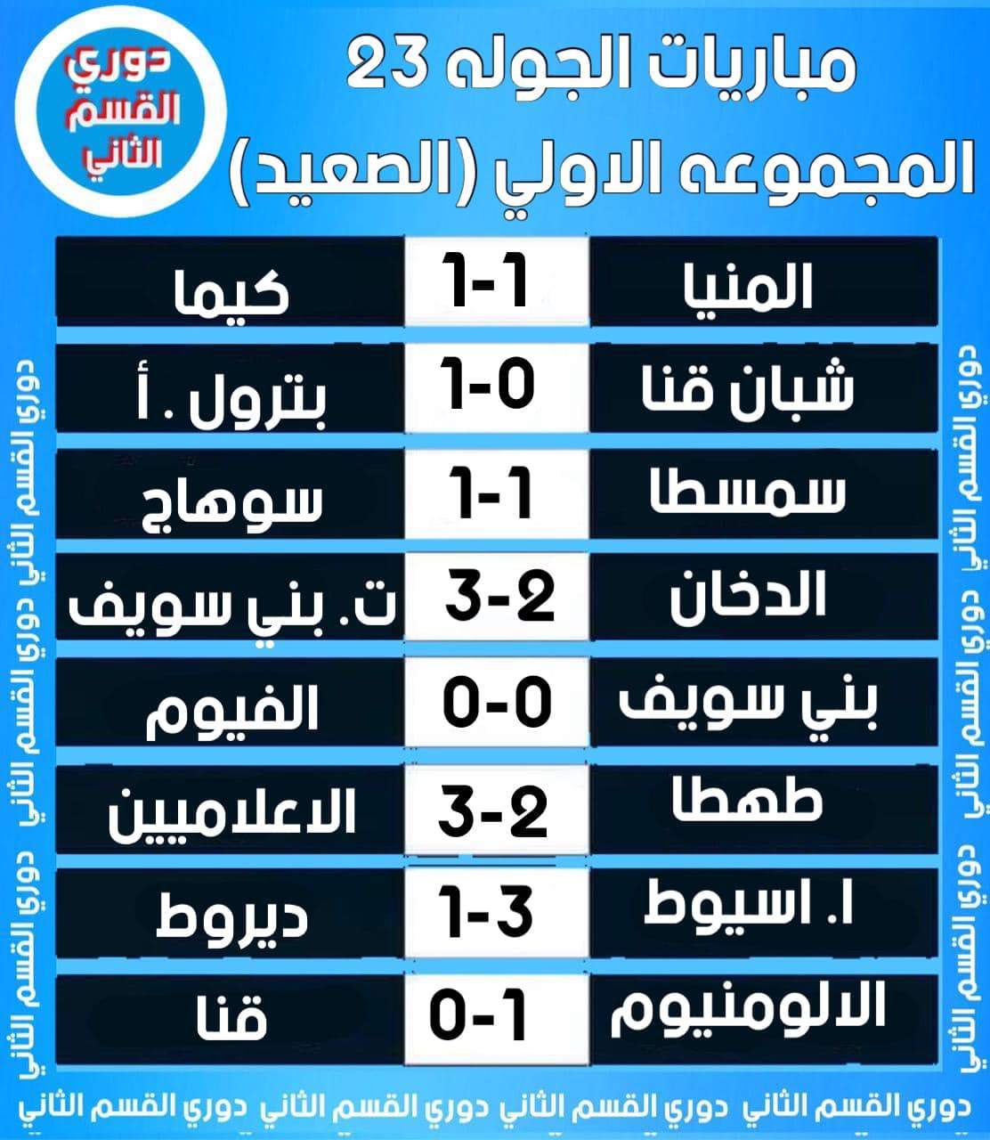 وانتهت مباريات الجولة الـ 23 لمسابقة دوري القسم الثاني بمجموعة الصعيد "المجموعة الأولى" بدوري القسم الثاني بالنتائج التالية: