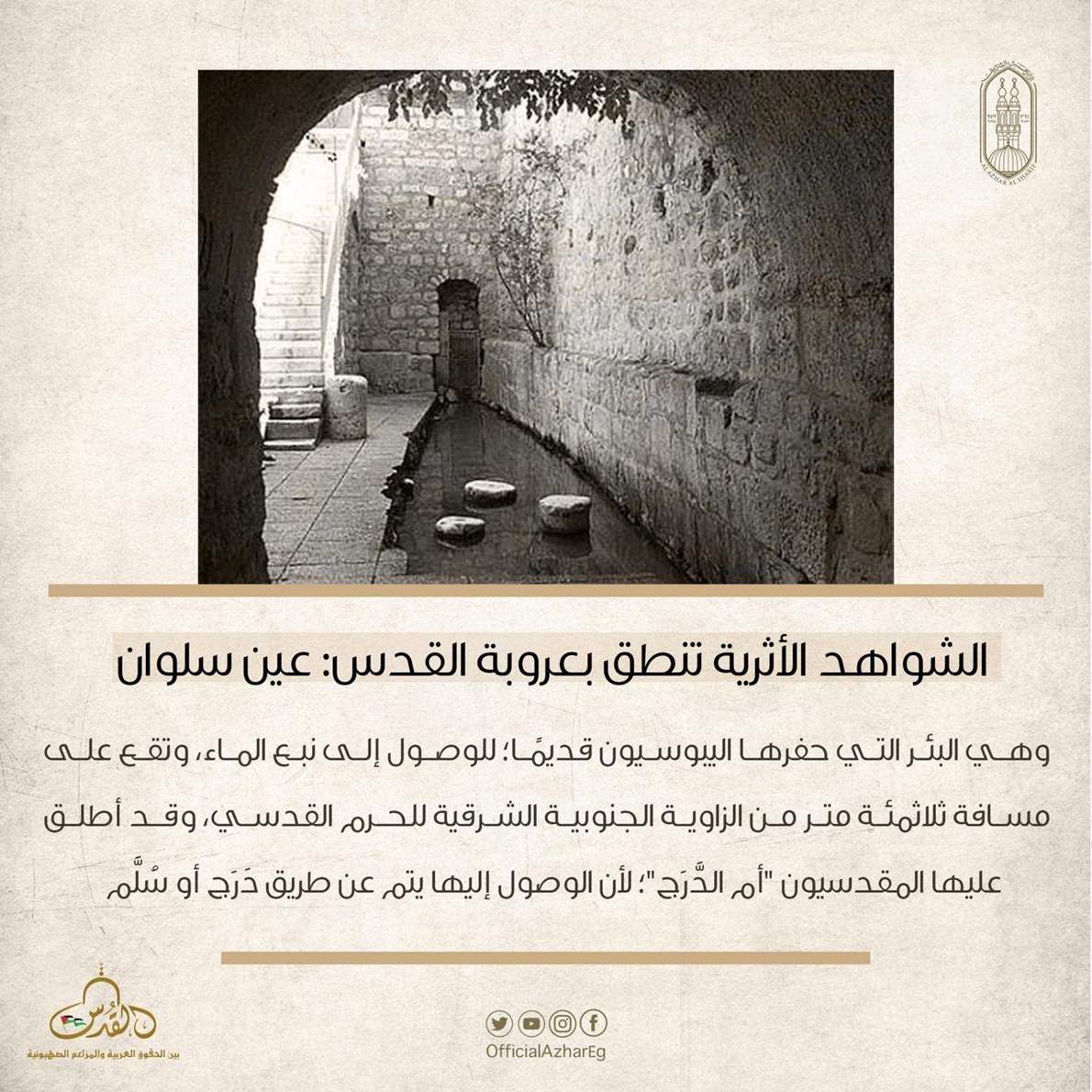 وأضاف الأزهر، عبر منشوراته، أن الشواهد الأثرية تنطق بعروبة القدس، مستشهدا بالعديد منها، ومن أبرزها: عين سلوان، وهي البئر التي حفرها اليبوسيون قديما؛ للوصول إلى نبع الماء، وتقع على مسافة ثلاثمائة متر من الزاوية الجنوبية الشرقية للحرم القدسي، وقد أطلق عليها المقدسيون "أم الدرج"؛ لأنَ الوصول إليها يتم عن طريق دَرَج أو سلم.