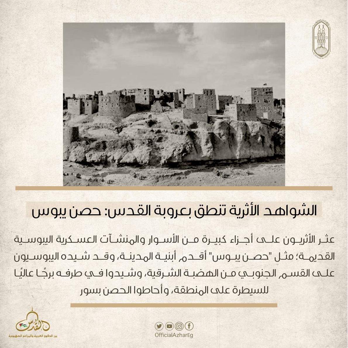 أكد الأزهر الشريف من خلاله صفحاته الرسمية على مواقع التواصل الاجتماعي أن العديد من الشواهد الأثرية تدل دلالة قاطعة على الأصول العربية للحياة في القدس؛ الأمر الذي يكشف بطلان الزعم الذي يتم ترويجه بأن بني إسرائيل لهم صلة بالقدس أو نشأتها، لافتا إلى أن مدينة القدس تم تأسيسها على يد اليبوسيبن العرب، قبل وجود بني إسرائيل العابر والطارئ بها بما يقارب 30 قرنًا من الزمان.