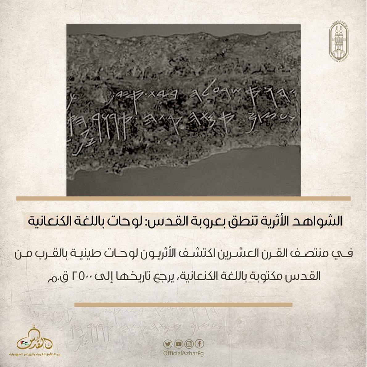 أما ثالث الشواهد الأثرية، التي ذكرتها صفحة الأزهر والتي تنطق بعروبة القدس، فهو اكتشاف الأثريين فى منتصف القرن العشرين لوحات طينية بالقرب من القدس مكتوبة باللغة الكنعانية، يرجع تاريخها إلى 2500 ق.م.