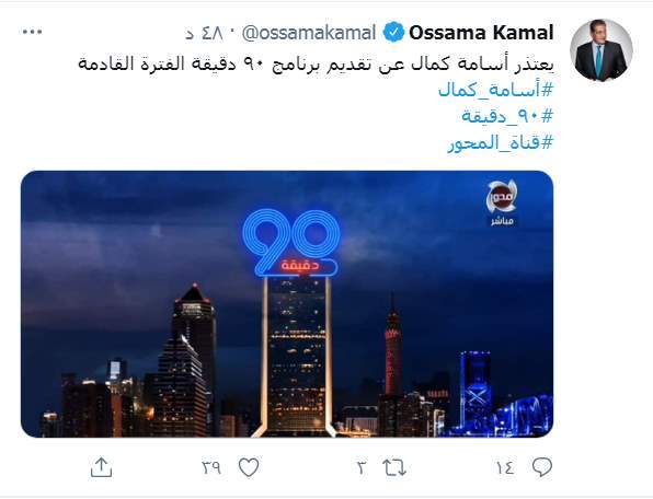 وكتب "كمال" تويتة على حسابه الخاص بموقع التويتات القصيرة "تويتر"، قائلًا: "يعتذر أسامة كمال عن تقديم برنامج 90 دقيقة الفترة القادمة".