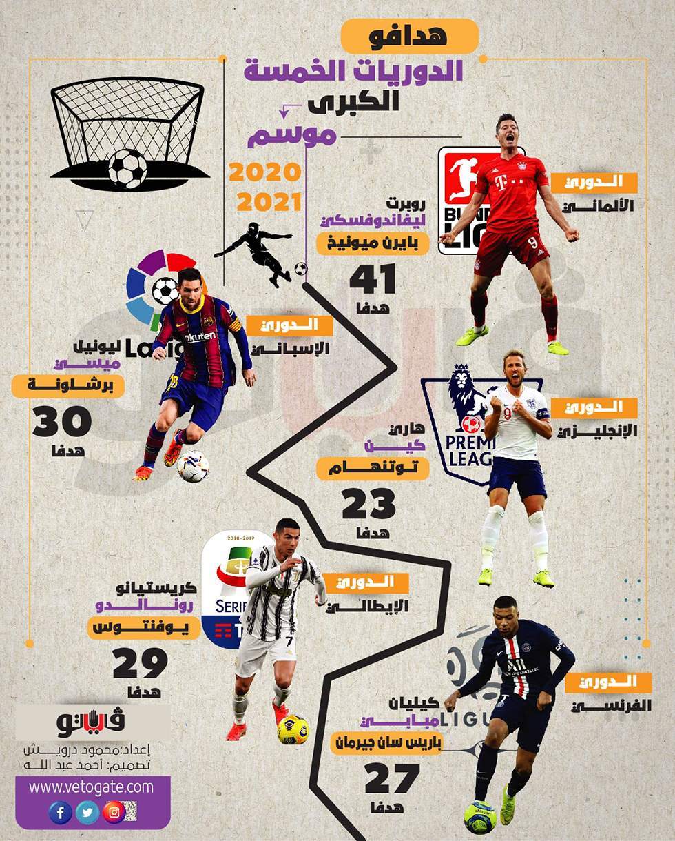هدافو الدوريات الخمسة الكبرى موسم 2020 -2021 | إنفو جراف