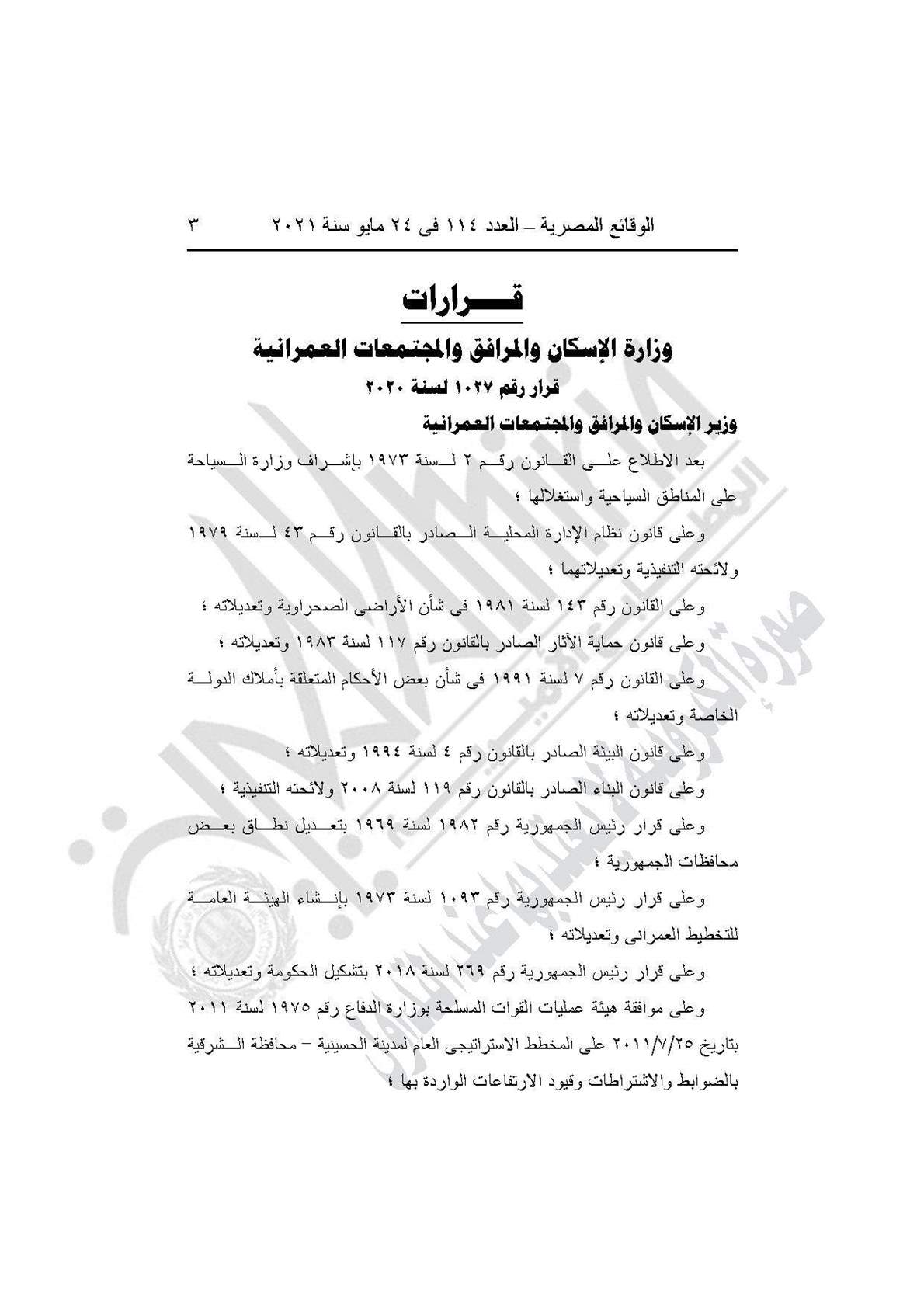 وجاء ذلك بعد الاطلاع على القانون رقم 2 لسنة 1973 بإشراف وزارة السياحة، وعلى قانون نظام الإدارة المحلية الصادر بالقانون رقم 42 لسنة 1979 ولائحته التنفيذية وتعديلاتهما، وعلى القانون رقم 143 لسنة 1981 في شأن الأراضي الصحراوية وتعديلاته، وعلى قانون حماية الآثار الصادر بالقانون رقم 7 لسنة 1991 في شأن بعض الأحكام المتعلقة بأملاك الدولة، وقانون البيئة 4 لسنة 1994، وقانون البناء رقم 119 لسنة 2008.