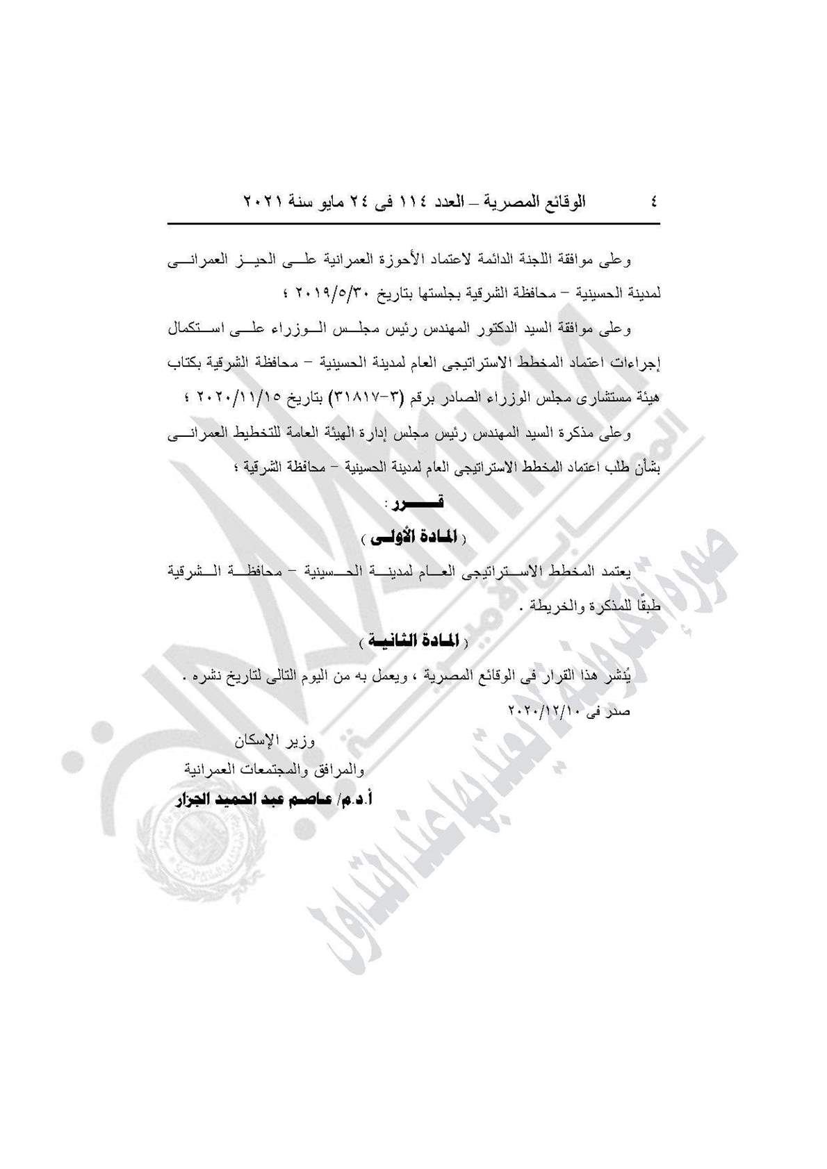 نشرت جريدة الوقائع المصرية في عددها رقم 114، الصادر في 24 مايو 2021، قرار وزارة الإسكان والمرافق والمجتمعات العمرانية رقم 1027 لسنة 2020، بشأن اعتماد المخطط الاستراتيجي العام لمدينة الحسينية.