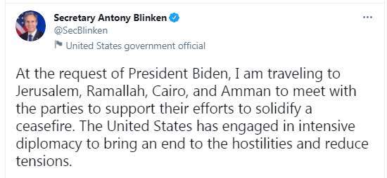 وكتب أنتوني بلينكن تغريدة على تويتر قال فيها: "بناء على طلب الرئيس بايدن، أسافر إلى القدس ورام الله والقاهرة وعمان للقاء الأطراف لدعم جهودهم في ترسيخ وقف إطلاق النار. لقد انخرطت الولايات المتحدة في دبلوماسية مكثفة لإنهاء الأعمال العدائية وتخفيف التوترات".