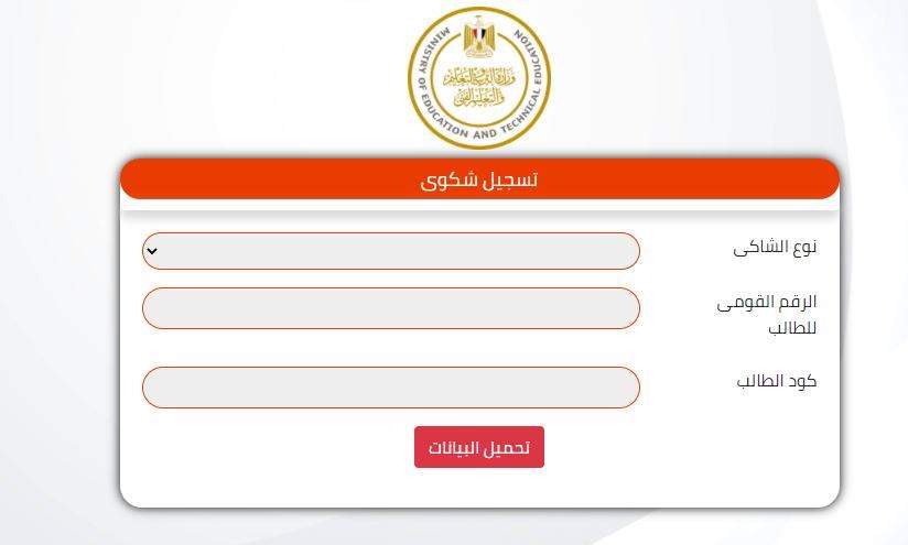 ويمكن الطالب تقديم شكواه من خلال الدخول على الرابط من هنا ثم إدخال البيانات وهي (نوع الشاكي، الرقم القومى للطالب، وكود الطالب).