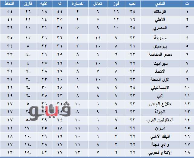 جدول ترتيب الدوري الممتاز بعد فوز الزمالك على المصري