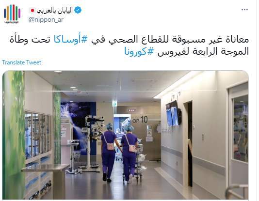 وكتبت اليابان بالعربي تغريدة على تويتر قالت فيها: "معاناة غير مسبوقة للقطاع الصحي في #أوساكا تحت وطأة الموجة الرابعة لفيروس #كورونا".