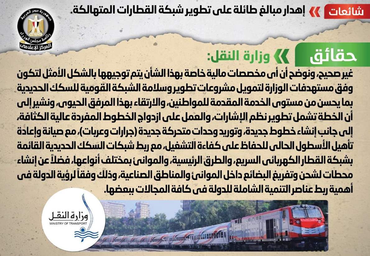 وقام المركز الإعلامي لمجلس الوزراء بالتواصل مع وزارة النقل، والتي نفت تلك الأنباء، مُؤكدةً أنه لا صحة لإهدار مبالغ طائلة على تطوير شبكة القطارات المتهالكة، مُوضحةً أن أي مخصصات مالية خاصة بهذا الشأن يتم توجيهها بالشكل الأمثل لتكون وفق مستهدفات الوزارة لتمويل مشروعات تطوير وسلامة الشبكة القومية للسكك الحديدية بما يحسن من مستوى الخدمة المقدمة للمواطنين، والارتقاء بهذا المرفق الحيوي.