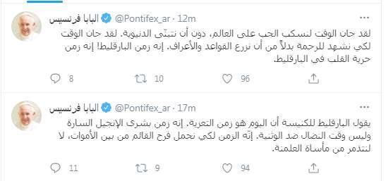 وكتب البابا فرنسيس تغريدة على تويتر " لقد حان الوقت لنسكب الحب على العالم، دون أن نتبنّى الدنيوية. لقد حان الوقت لكي نشهد للرحمة بدلاً من أن نزرع القواعد والأعراف. إنه زمن البارقليط. إنه زمن حرية القلب في البارقليط".