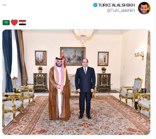 وكان الرئيس عبد الفتاح السيسي استقبل أمس الوزير تركي آل الشيخ، مستشار الديوان الملكي بالمملكة العربية السعودية ورئيس مجلس إدارة الهيئة العامة للترفيه، وذلك بحضور عباس كامل رئيس المخابرات العامة.