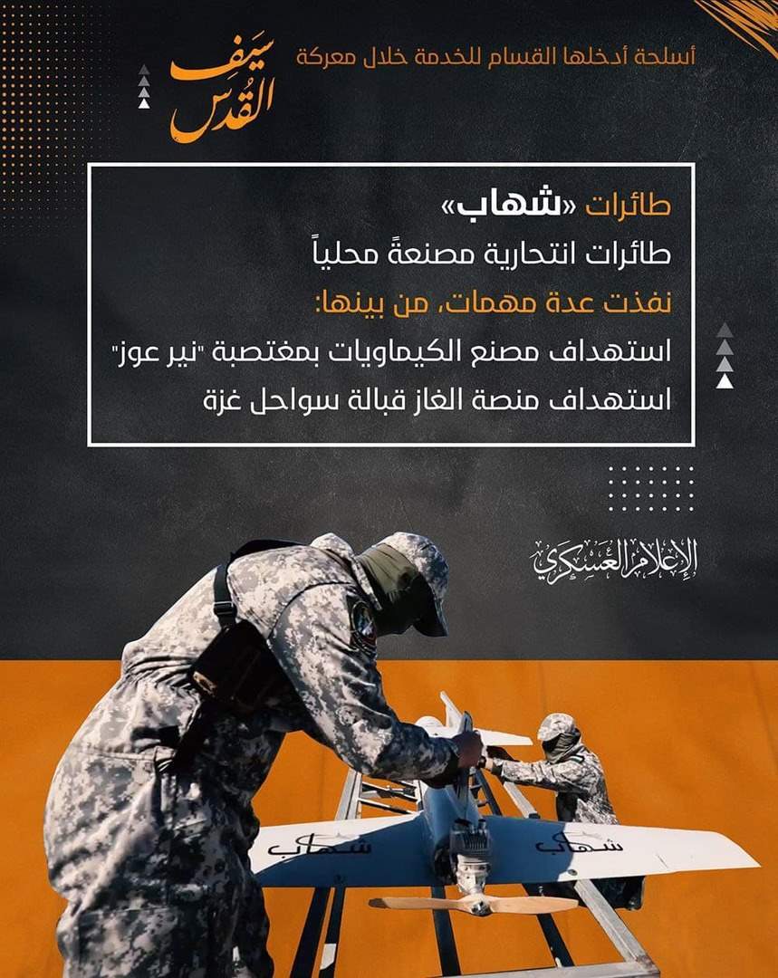 كما أدخلت القسام طائرة "شهاب" الانتحارية المصنعة محليا، حيث نفذت خلال المعركة الأخيرة عدة عمليات من بينها، استهداف مصنع الكيماويات بمستوطنة "نير عوز" ومنصة الغاز قبالة سواحل غزة.
