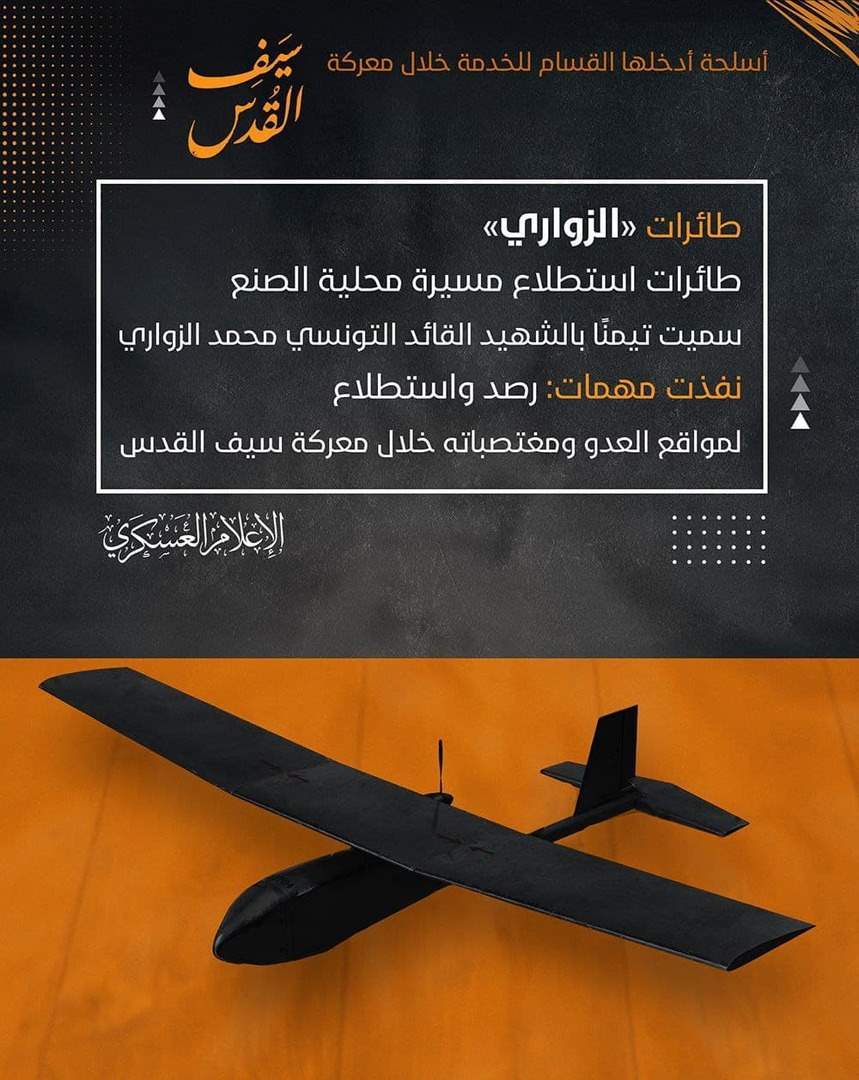 وأعلنت "كتائب القسام" عن طائرات استطلاع مسيرة محلية الصنع "الزواري"، إذ سميت بهذا الاسم تيمنا بالقائد التونسي محمد الزواري، ونفذت عدة مهمات رصد واستطلاع لمواقع ومستوطنات الاحتلال خلال معركة "سيف القدس".