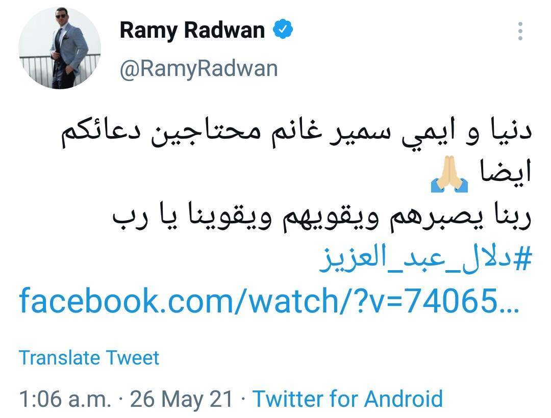وكتب رامي رضوان قائلا: "دنيا و ايمي سمير غانم محتاجين دعائكم ايضا.. ربنا يصبرهم ويقويهم ويقوينا يا رب.. #دلال_عبد_العزيز".