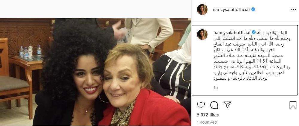 وقبل 48 ساعة أعلنت الفنانة نانسي صلاح وفاة شقيقتها، وذلك بعد وفاة والدتها بيومين، وكتبت عبر حسابها بموقع إنستجرام "البقاء والدوام لله وحده لله ما أعطى ولله ما أخذ انتقلت إلى رحمة الله أمي التانية ميرفت عبد الفتاح العزاء والدفنة بإذن الله في المقابر.. مسجد السيدة نفيسة بعد صلاة الضهر اللهم أجرنا في مصيبتنا".