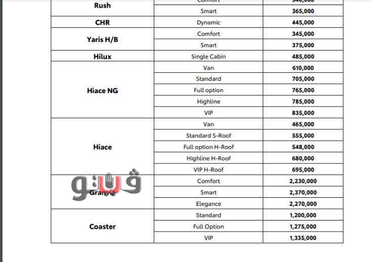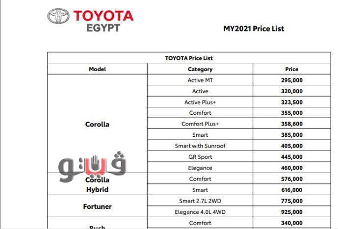 وتضمنت القائمة أسعار سيارات تويوتا كورولا بفئاتها التسعة والتي بدأت من 295 ألف جنيه وصولاً لـ 460 ألف جنيه في الفئة الأعلى، والسيارة كورولا هايبرد بفئتيها بسعر 576 و 616 ألف جنيه، والسيارة راش بفئتيها والسيارة ياريس بفئتيها و CH-R التي تأتي بفئة واحدة.