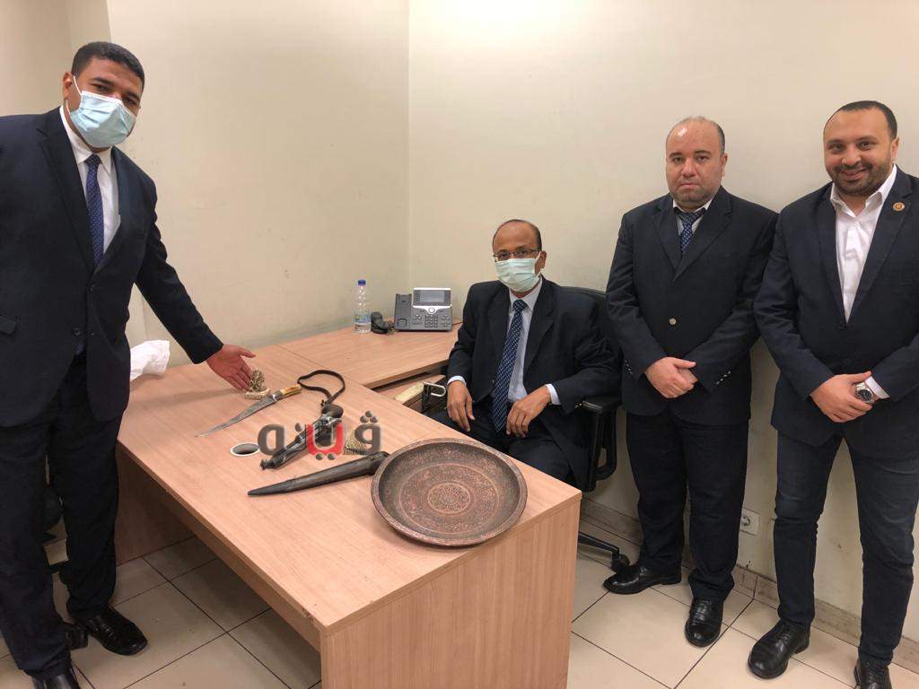 بحوزته خنجر محظور حيازته وطبنجة أثرية بحوزته راكب أثناء إنهاء إجراءات وصوله قادما من الإمارات، وتم تحرير محضر بالواقعة.