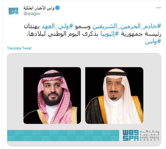 كما بعث ولي العهد نائب رئيس مجلس الوزراء وزير الدفاع الأمير محمد بن سلمان بن عبد العزيز آل سعود، برقية تهنئة مماثلة لرئيسة جمهورية إثيوبيا الفيدرالية الديمقراطية سهلي ورق زودي، بهذه المناسبة.