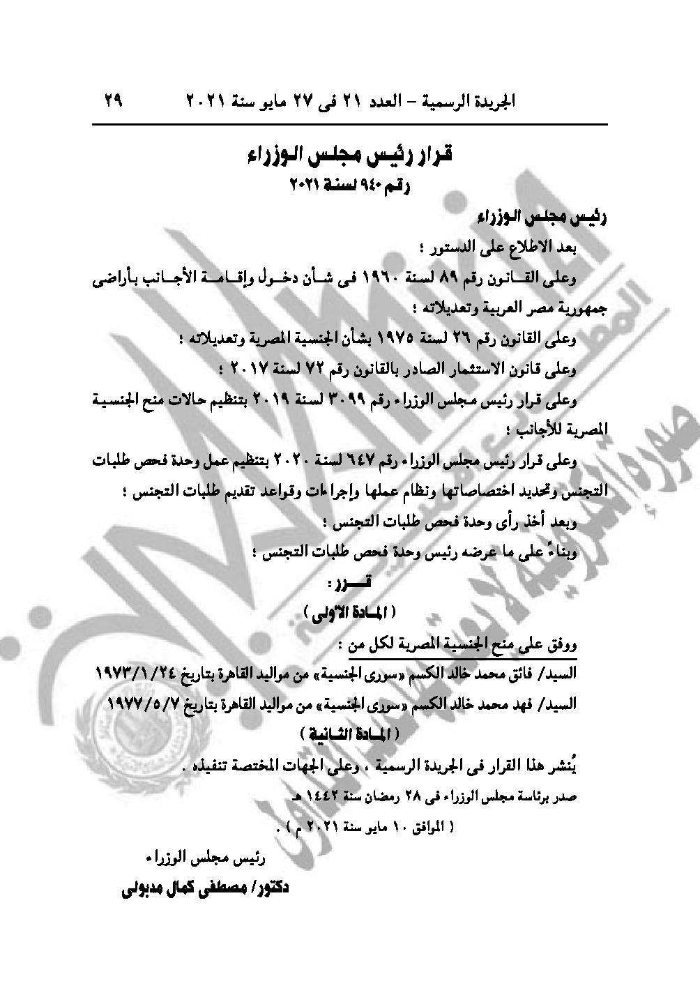 القرار رقم 940 لسنة 2021 بالموافقة على منح الجنسية المصرية لـ "فائق محمد الكسم"، سوري الجنسية، و"فهد محمد خالد الكسم"، سوري الجنسية.