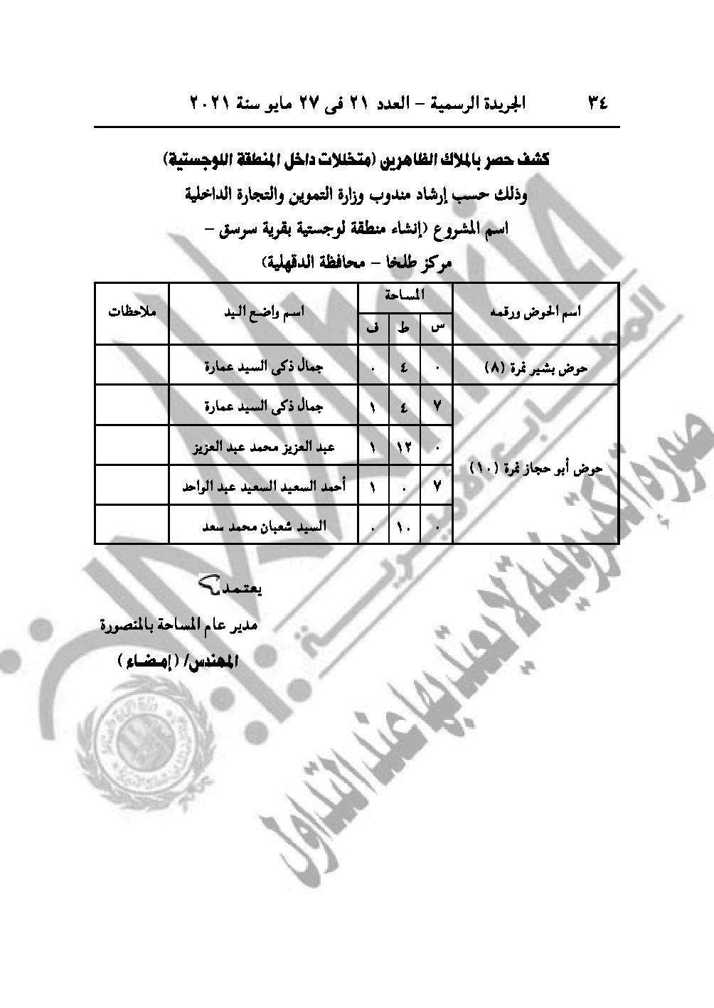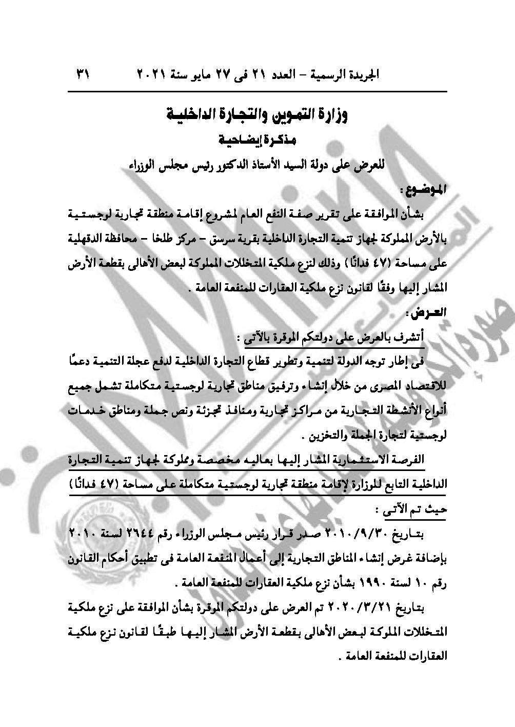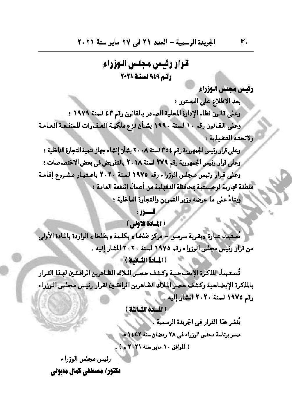والقرار رقم 949 لسنة 2021، باستبدال عبارة "بقرية سرقس- مركز طلخا"، بكلمة "بطلخا" الواردة بالمادة الأولى من قرار رئيس مجلس الوزراء 1975 لسنة 2020.