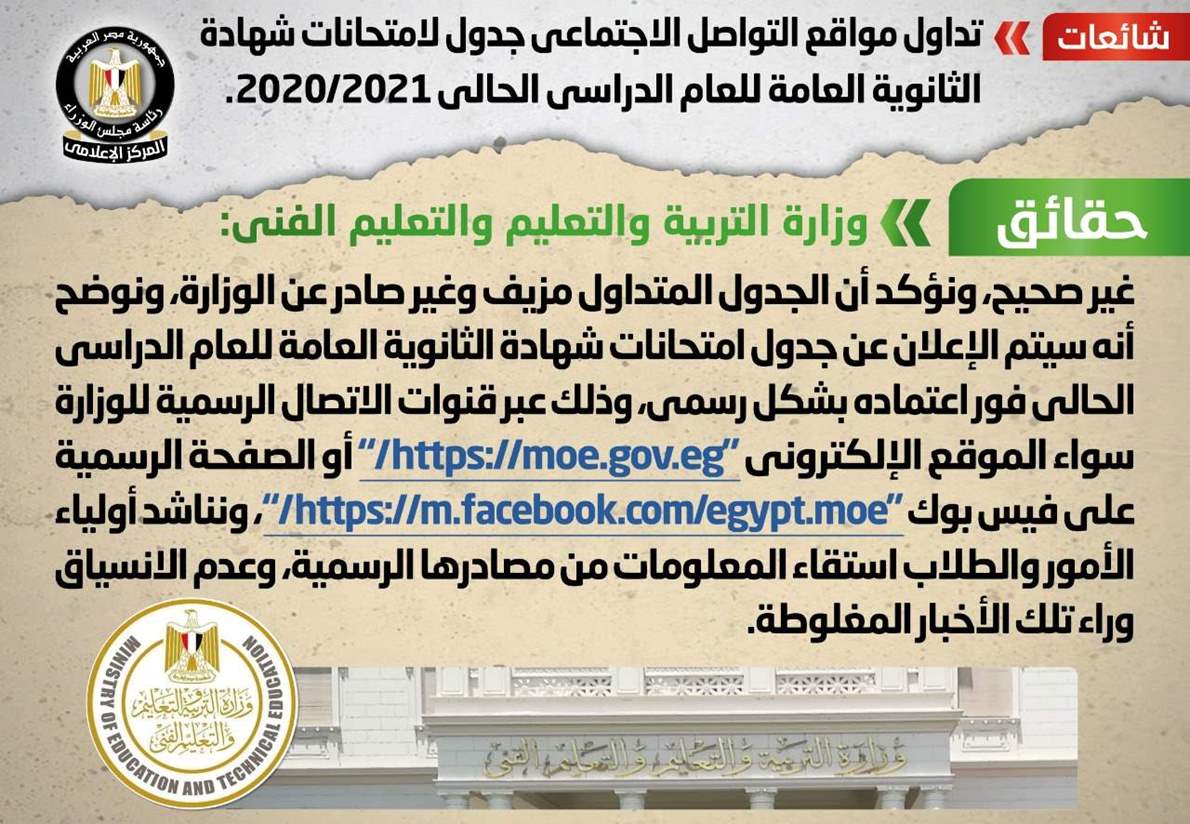 وتواصل المركز الإعلامي لمجلس الوزراء مع وزارة التربية والتعليم والتعليم الفني، والتي نفت تلك الأنباء، مُؤكدةً أنه لا صحة للجدول المتداول لامتحانات شهادة الثانوية العامة للعام الدراسي الحالي 2020/2021، وأن الجدول المتداول مزيف وغير صادر عن الوزارة.