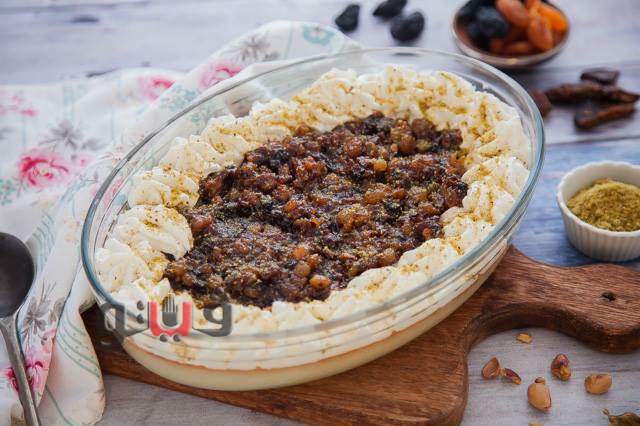 تضاف الفواكة المجففة والقرفة على العزيزية، ويقلب المزيج جيدا .