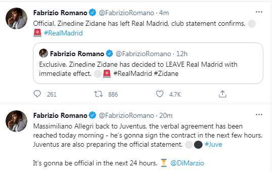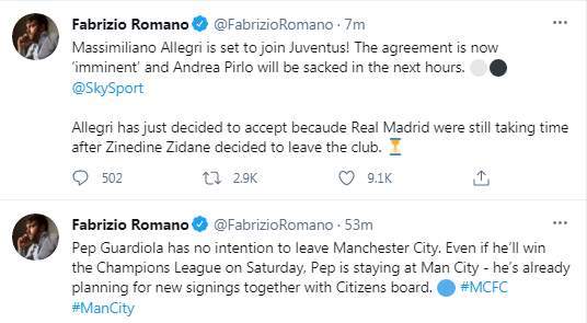 وقال فابريزيو إن "ماسيميليانو أليجري جاهز للانضمام إلى يوفنتوس! الاتفاق "وشيك" الآن وسيتم إقالة أندريا بيرلو في الساعات المقبلة. قرر أليجري للتو القبول لأن ريال مدريد لا يزال يمضي بعض الوقت بعد أن قرر زين الدين زيدان مغادرة النادي"